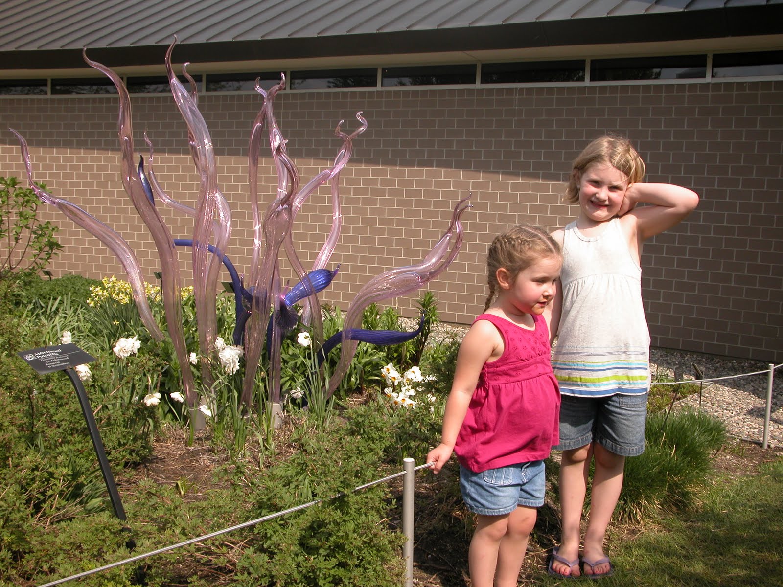 I LOVE going to the gardens and checking out all the cool art they have there. The girls love to go to the Children's Garden. We also got to check out the butterfly exhibit they had there--it was the last day of the exhibit. As a bonus it was also the first day of the Chihuly exhibit. Chihuly is a glass artist who makes amazing pieces of art.